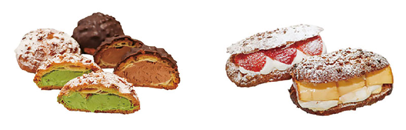 ▲姉妹品も充実。(左)抹茶クリームたっぷりの「抹茶パリ」と、チョコクリームを詰め、さらにシュー皮をチョコでコーティングした「チョコパリ」。(右)自家製プリン入りの「シュープリン」、真っ赤ないちごが目を引く「いちごシュー」