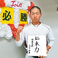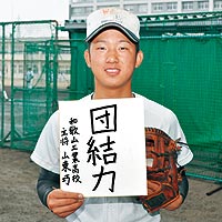 春の選抜大会を経験し、全員が甲子園という同じ方向を目指して頑張っています。他校に比べて部員は少ないですが、学年を超えて仲が良く、練習法やミスについてアドバイスし合い、チーム一丸で取り組んでいます。ピンチの時も全員でカバーし、〝結束力〟を生かしたプレーで勝ち進みたい。