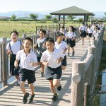 午前8時前、池のほとりを元気いっぱいに駆ける子どもたち… -