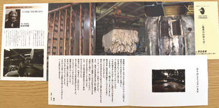 「社長の人柄、思いをつなぐ」。岡さんは以前、加工の過程を工場で撮影した写真を探し、社長の顔写真、百合子さんが働く姿をつづら折りの小さなアルバムのようにし、組合記念誌に社長が記したメッセージをそえました。二つ折りのあいさつ状は開く時に手のふれる所に革を施し、その感触とともに百合子さんの感謝の言葉が続きます。「革の歴史博物館を作る夢は叶わなかった」の一文に胸がうたれます。百合子さんは「県外から嫁に来て昔ながらの大家族、仕事と苦労がありました。そのことを知り、支え合ってきた人から『お疲れ様。よくここまでやってこれたね』と心からねぎらって頂き、電話口で泣きました。社長や私の心にあった思いをよく表現してくれました」と感謝します。