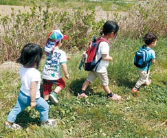 森のようちえんでは自然そのものが遊び道具です。季節の変化や景色を楽しみます。裸足で走り回ってもかまいません。カリキュラムをこなすのではなく、お散歩が基本になりますが、時には刃物を使った調理も行わせます。また、和歌山ならではの体験も積極的に取り入れる予定です。
