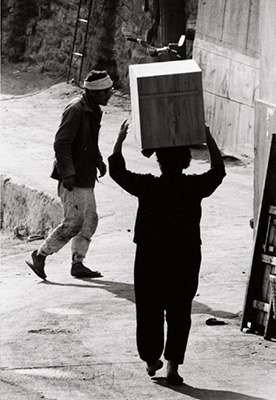 作品集は、雑賀崎の人が頭に荷物を乗せて歩く姿にひかれ、通い詰めたのがベースにあります。餅箱、米、一斗缶と様々なものを頭に乗せる姿は雑賀崎独特のものでした。和歌浦干潟の海苔づくり、港でトロ箱を焼いて暖をとる漁師さん、旧正月で着飾った子どもたち。集魚灯、まげを結ったお婆さん……。今はもう見られない、その時そこにしかなかった日常が光っています。「記録であると同時に作品として面白さは意識します。しかし、作為は加えません」。さりげないながら、遠くに感じるほどの限りない奥行きをいずれの作品も持ち、「肉眼で見えないところを写したい」との松原さんの視線が貫かれています。