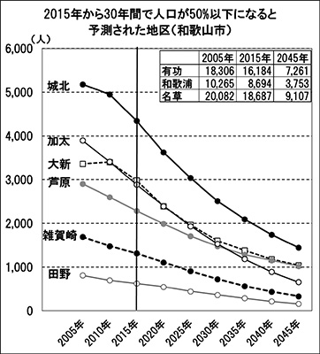 2015年から45年までの30年間で、山口、貴志、宮北、安原など9地区では人口が増加する予測ですが、逆に50%以上大きく減少する地区も9地区あります。加太、雑賀崎、田野は4分の1に、中心市街地でも大新、城北が3分の1と急激な人口減少がみられます(図)。