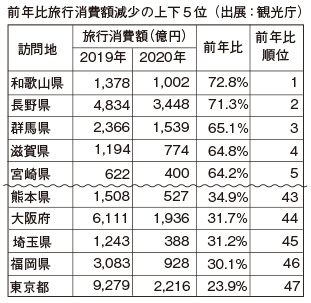 国内旅行消費額をみると、観光庁の公表では、昨年、日本人が10・3兆円で一昨年から12・9兆円減、外国人が0・7兆円(試算値)で、一昨年と比べると4・1兆円の減少です。