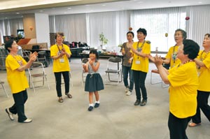 もしもし亀よ♪亀さんよ♪ 童謡に乗せてテンポ良く両手で2個のお手玉を操る迪さん。シニア世代の仲間たちがその様子を見守ります。最後まで失敗せずにできると拍手。メンバーからアドバイスをもらい、もっと難しい技に挑みます。母の美也子さん(41)は「汗だくになるまで集中して練習します。得意なものが見つかり、自信になっているようです」。