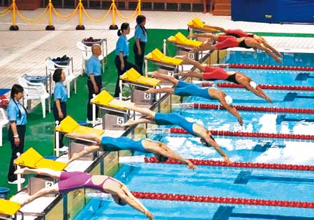 大会で使う本格的なプールは建物の中。50㍍、25㍍の両方で大会を開けます。