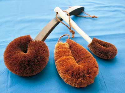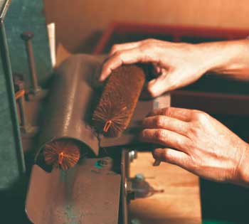 たわし専用の散髪機で飛び出たシュロの毛を切ります。この後、たわしの形に曲げたり、使う時に持つ部分を付け、日に当てて乾かすと…