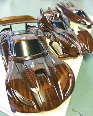 同下=昨年の大会、賞品となったミニ四駆のボディ。本物の木に見える