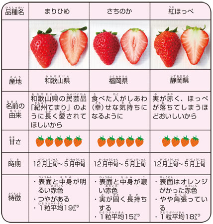 子どもから大人まで人気のいちご。紀の川市貴志川町神戸にある貴志川観光いちご狩り園ではまりひめ、さちのか、紅ほっぺがつくられています。特徴や見分け方を知って、食べ比べませんか? 育てる小日向(こひなた)浩さんに教わりました。
