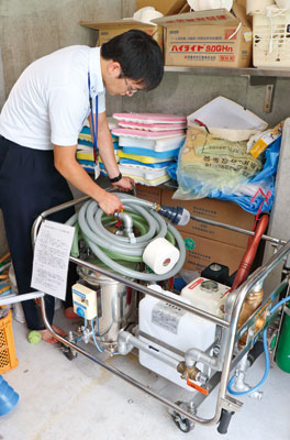 次にプールへ。倉庫の中に入ると、機械が置かれていました。水をきれいにする緊急時用浄水装置(写真)です。