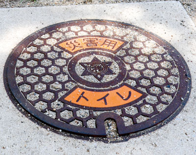 井戸の近くには「災害用トイレ」と書かれたマンホールが並んでいます。この上に便器を置いてテントで囲い、緊急用のトイレにします。