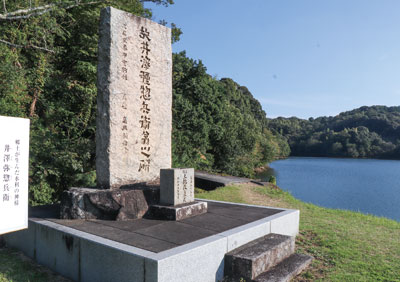 同下=弥惣兵衛が造った亀池のすぐ近くに石碑があります