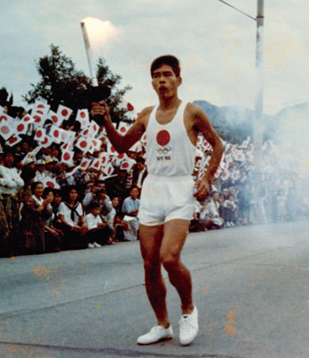 写真=1964年、多くの人の前で聖火をつなぐ宇田さん