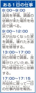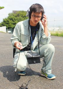 「蛇口からにごった水が流れたり、水道管から漏れた水が道路にたまったりした時、専用の機械を地面に当て、地下にある水道管の音を調べ、壊れていたら修理します」