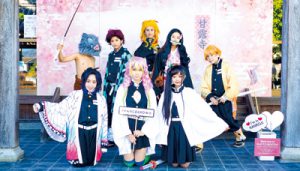 写真=甘露寺で『鬼滅の刃』のキャラクターになりきり写真を撮るファン