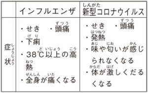 インフルエンザや新型コロナウイルスにかかると、下の表のような異常が体に出てきます。