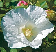 【問題2】朝咲いて、夜にしぼむスイフヨウの花。朝は写真(左)のように白ですが、夕方には何色になる?(ヒント=スイフヨウは漢字で書くと「酔芙蓉」)