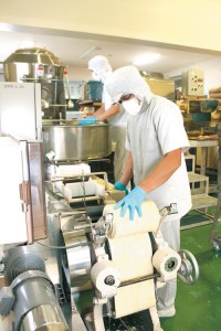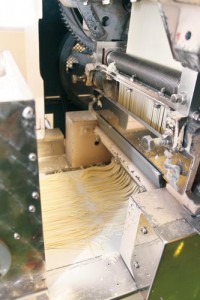 混ぜた生地を機械で1㌢ぐらいの厚さに伸ばします。バウムクーヘンのようにころころ巻き、約2時間ねかせます。「こうすることで、しっとりとコシのあるめんになります」と柏木社長。