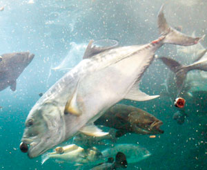 アジが中心ですが、栄養バランスも考えてイカやエビも与えます。1回の量は夏は50㌔、冬は40㌔ほど。真っ先に食いついてくる食いしん坊がロウニンアジです(写真)。