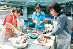 えさになる魚は午前中にマイナス20度の冷凍庫から出しておき、3人の職員が1匹ずつ、食べやすいサイズに切ります。