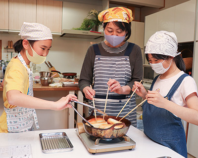 現在、会員は5歳〜中学生の約50人で、大阪から通う子もいます。高松小4年の石川遥萌(いしかわ はるも)さんは「お気に入りは、つぶしたゆで卵とマヨネーズの細巻き!」。高松小5年の田尻灯里(たじり あかり)さんは「特においしかったのが、パインとコーンのピザ。あと、にぼしで出汁を取ったみそ汁も」と笑顔です。