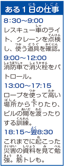 「火事、川や海での事故のほか、地震や台風で被害が出た現場から人を救出します。どんな状況でも動けるよう、日ごろから訓練しています」