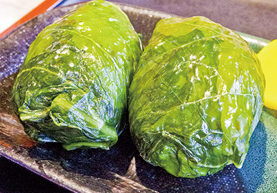 【問2】めはり寿司(写真)は塩漬けにしたある野菜をおにぎりに巻いて作ります。何?