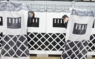 城内のわかやま歴史館前では土曜、日曜、祝日に、ゴムでできた手裏剣投げや隠れ身の術などの忍者体験ができます。隠れ身の術とは、城の壁や石垣の絵が書かれた布の後ろに隠れ、どこにいるのか分からないようにする忍術です。