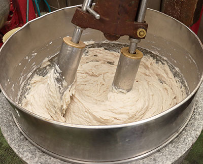 形を整える機械に練った身を入れる。出てきた身は、円柱を半分にしたような形。これを板にのせて切っていく。