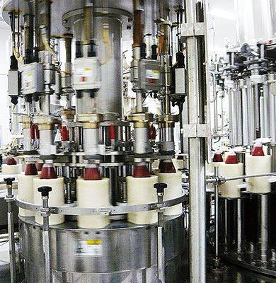 機械でケチャップを容器に詰める。さらに別の機械に移し、アルミシールで容器にふたをする。