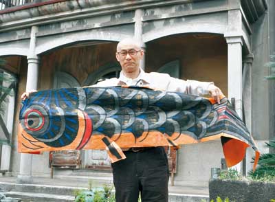 1877年に建てられた郭家住宅に、戦前のものと思われる和紙製のこいのぼりを展示する。郭家住宅の保存、活用に取り組む郭家住宅の会世話人代表の西山修司さんが同市の古美術商で見つけたもので、金や青、赤色で模様が手描きされた全長210㌢の真鯉。