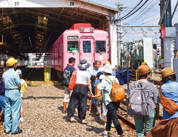 南海電鉄の車庫見学(写真)、フラメンコ体験、抹茶体験、山吹温泉での落語、グラウンドゴルフ体験、アクセサリー作りなど25プログラム。詳細は市駅グリーングリーンプロジェクトHP