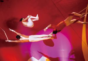 写真上=大技イカリオス、同下=息をのむ空中ブランコ