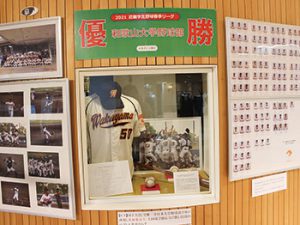 ◎和歌山大学野球部展=開催中。今年の近畿学生野球リーグ・全日本大学野球選手権代表決定戦で優勝した和大野球部を紹介。部員紹介パネルや、優勝を決めたウイニングボール、スナップ写真など