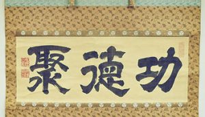 紀州藩10代藩主、徳川治宝(1771〜1852)は、茶道、雅楽、絵画といった文化芸術を愛し、「数奇の殿様」と呼ばれた。生誕250年を記念し、江戸時代後期の和歌山の文化に影響を与えた治宝ゆかりの史料を紹介。肖像画パネル、治宝筆「書『功徳聚』」(写真)、菓子木型、南紀男山焼の花入など。午前9時〜午後5時半。