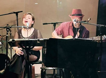 てんちち、松本陽太、tina&yoshi(写真)など和歌山で活動する9組が出演。途中、対岸のマリーナシティで打ち上げられる花火を楽しむ。