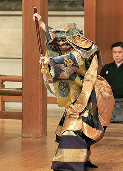 片山九郎右衛門をシテに観世流能「熊坂」(写真)を演じる。旅僧がかつて悪行を働いた熊坂長範の亡霊と出くわす。熊坂は大商人を襲い討たれたのを語り出す。狂言は「棒縛」。酒を盗み飲みする太郎冠者、二郎冠者を主人はしばり出掛ける。2人は協力し酒を飲み始めるが…。