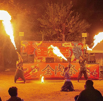 両日午後6時と7時半からファイヤーパフォーマンス集団「幻火」によるショー(写真)、7日午前11時〜午後5時は20日、21日に和歌山城で開く音楽と食のイベント「音口食(オトグライ)」PRライブも。