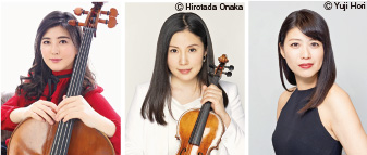 国内外で活躍するチェリストの上村文乃(写真左)、ヴァイオリニストの米元響子(同中)、ピアニストの菊池洋子(同右)が出演。シューベルト『即興曲集第3番D935変ロ長調』、ベートーヴェン『「魔笛」の主題による12の変奏曲』、バッハ『無伴奏チェロ組曲第3番ハ長調』ほかを披露。