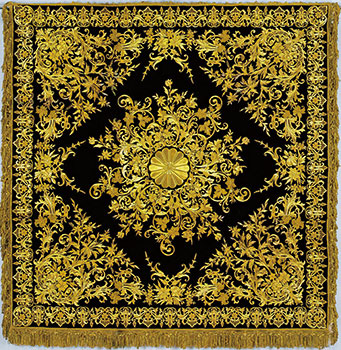 宮内庁三の丸尚蔵館の皇室コレクションから、県ゆかりの作家による絵画や工芸品、県の名勝地をテーマにした作品を紹介。平安時代に活躍した歌人、西行の書状や、修験者が熊野の山中を通り本宮、湯の峰に向かう様子を描いた岩佐又兵衛筆「をくり巻十三」、エルトゥールル号を日本へ遣わせたトルコ皇帝から皇室へ贈られた「紫天鵞絨地花文刺繍卓被(むらさきびろうどじはなもんししゅうたくひ、写真)など47点。