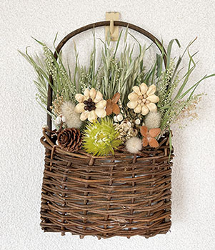 8月26日㊎午前10時、和歌山市松江の西松江緑地体育館。種や木の実で作った花と植物をカゴに飾り、壁掛けのバスケットを製作(写真)。2000円。持ち帰り用の袋持参。希望者は河西緩衝緑地管理事務所(073・451・8355)。先着15人。
