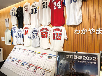 1月9日㊊まで、和歌山市本町のフォルテワジマ3階。プロ野球各球団に所属する県ゆかりの選手を紹介。ロッテの松川虎生、楽天の西川遥輝、ヤクルトの山崎晃大朗、ソフトバンクの津森宥紀選手ら23人のユニフォームやバットが並ぶ。午前10時~午後7時。わかやまスポーツ伝承館(073・423・2215)。なお、同館は4日㊌から開館。