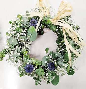 8月19日㊏午後1時半、和歌山市松江の西松江緑地体育館。ユーカリを使った涼しげなリース(写真)を作る。3500円。エプロン、持ち帰り用袋持参。申し込みは河西緩衝緑地管理事務所(073・451・8355)。先着20人。