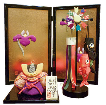 写真=押し絵屏風、古布の木目込み兜と鯉のぼりの置物