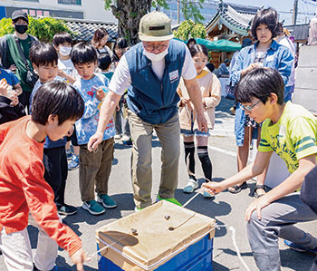 4月29日㊌午前10時、和歌山市中島の慶哉寺。釈迦の誕生を祝う地域の祭り。子どもたちの演奏をはじめ、飲食や古本、雑貨のマルシェ、じゃんけん餅まき&お菓子まき、射的など、家族で楽しめるイベントが盛りだくさん。また、三世代の熱戦が繰り広げられるベーゴマ大会(写真)に、全国大会優勝者を加えたゲスト集団「東京ベーゴマ」が登場。真剣勝負で会場を盛り上げる。ベーゴマワークショップも。当日限定の特別御朱印頒布がある。同寺(073・471・0903)。