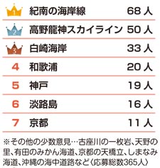 読者に「今まで行ったドライブで一番良かった所は?」と尋ねたところ、最多は田辺から白浜、串本、那智勝浦へと続く国道42号、紀南の海岸線でした。「海と夕陽の美しさ」が圧倒的で、「道の駅や絶景カフェに寄れ、高速よりのんびりできる」(57歳女性)との声も。