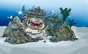 江戸時代の妖怪画家、鳥山石燕は中国の諺に基づき、栄螺鬼をこう解説する。「年月を経れば、雀もハマグリになり、ネズミもウズラになるという。ならばサザエが鬼になっても不思議でない」。万物は長い年月を生きると変化し、霊力を身につけるというのだ。和歌山にはこんな話が残る。海で溺れる美女を海賊が見つけ助け上げた。女があまりに美しいので、海賊たちは次々と近寄るが、実はその女、栄螺鬼が化けたものであり、近づく海賊たちの睾丸を全て食いちぎってしまった。海賊は睾丸を取り戻すため、栄螺鬼に莫大な黄金を支払った。金を金で返してもらうとは、こりゃタマらん話だ。