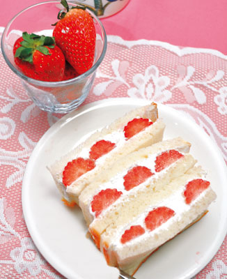 甘酸っぱい香りが漂う、旬を迎えた和歌山県産ブランドのいちご「まりひめ」を、たっぷりふわふわの生クリームではさんだサンド。やわらかく新鮮ないちごの酸味とのバランスを考えたクリームは甘めで、生クリームと牛乳を加えたパンは軽く優しい口当たりだ。同店の大江智子さんは「今年始めた期間限定商品です。ついついもう一つ食べたくなる味を目指しています」。