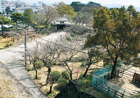 当時の大手門がどのような形式だったかは分かりませんが、現在の岡口門を往時の門と仮定してくぐってみましょう。狭い城門の空間から、一気に石垣と塀で囲まれた方形の広場が前方に開けます。