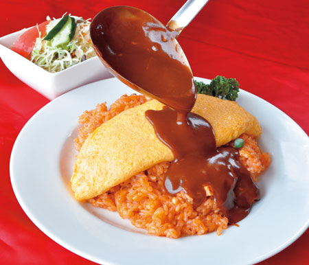 1933年創業の老舗洋食店フライヤ。店の命とも言えるドビソース(ドビグラスソース)を、チキンライスに乗せたオムレツにかける。バターでまろやかに仕上げたオムレツにナイフを入れると、中からトロトロの半熟卵があふれ出し、ドビソースの深い味わいと絶妙にからみ合う。